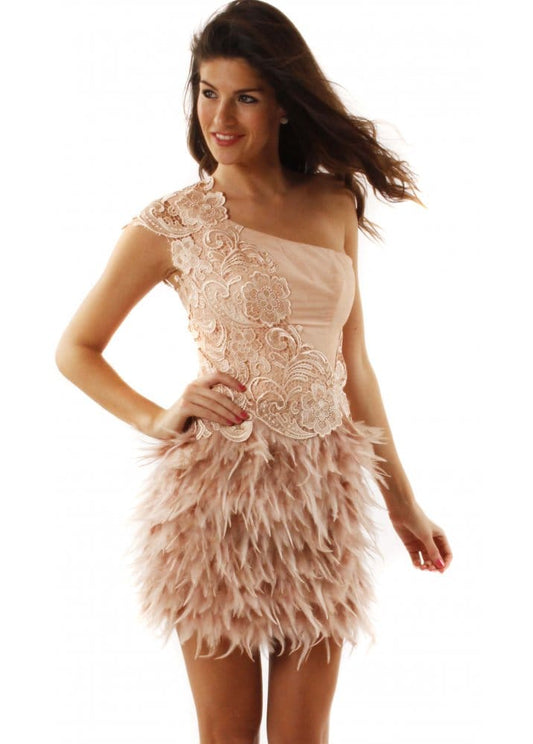 One shoulder lace feather dress Style Lucy Mecklenburgh in Beige